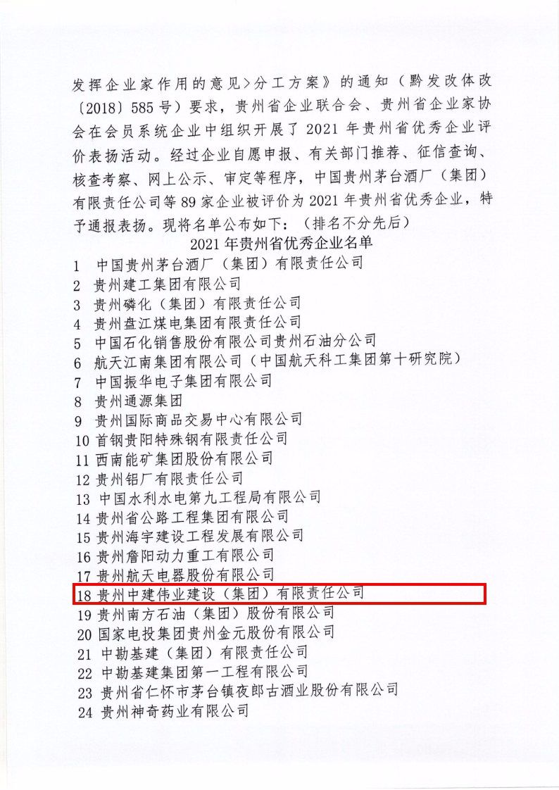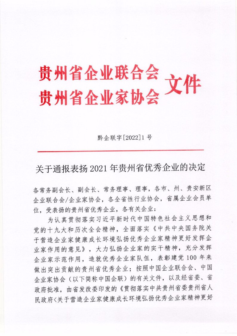 2022年1月10日,貴州省企業(yè)聯(lián)合會、貴州省企業(yè)家協(xié)會印發(fā)《關于通報表揚2021年貴州省優(yōu)秀企業(yè)的決定》,集團公司被授予“貴州省優(yōu)秀企業(yè)”榮譽稱號。