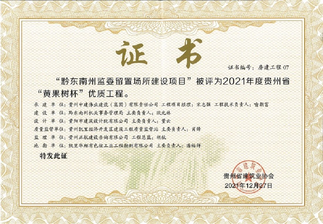 近日,從貴州省住房和城鄉(xiāng)建設(shè)廳傳來喜訊,公司承建的“黔東南州監(jiān)委留置場所建設(shè)項目”榮獲2021年度貴州省“黃果樹杯”優(yōu)質(zhì)工程獎。