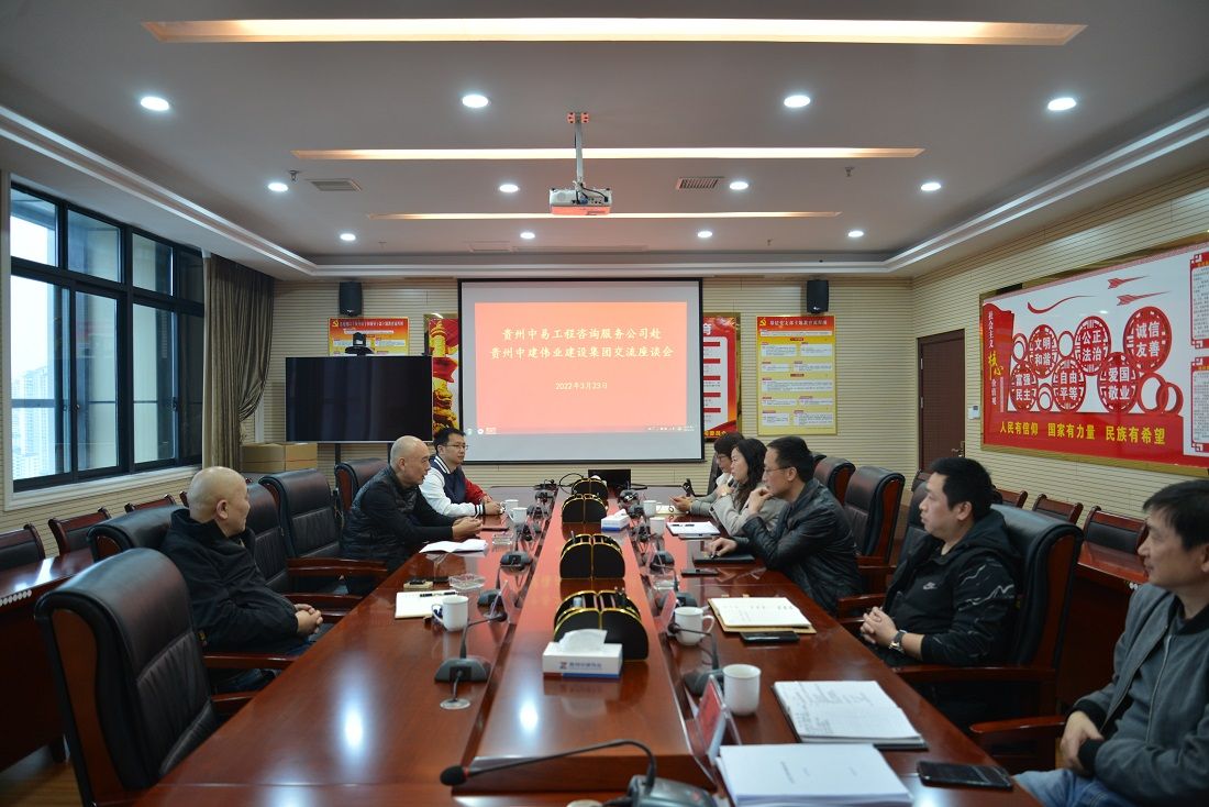 2022年3月23日,貴州中易工程咨詢服務(wù)公司董事長陳志平帶領(lǐng)公司資深專家鄧曉東、吳遼,到貴州中建偉業(yè)建設(shè)(集團)公司考察交流,集團公司黨委副書記、總經(jīng)理馮安翔熱情接待,黨委副書記、工會主席王莉,黨委委員、副總經(jīng)理王振田,總監(jiān)周世玲,質(zhì)安部經(jīng)理蔣煒參加座談。