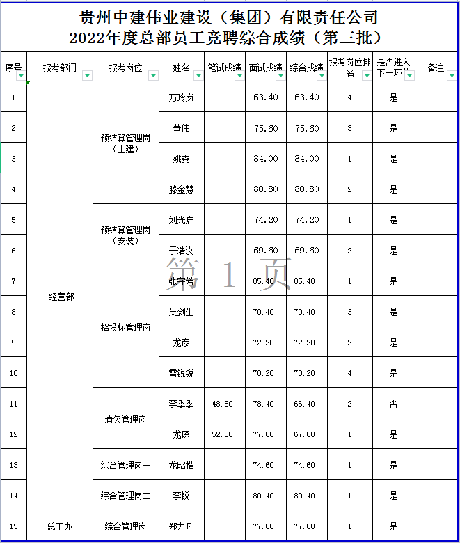 根據(jù)《貴州中建偉業(yè)建設(shè)(集團)有限責(zé)任公司總部員工競聘方案(第三批)》規(guī)定,經(jīng)報名、資格審查、面試等程序,現(xiàn)將綜合成績予以公示。
