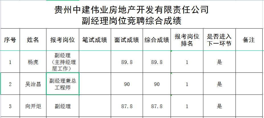 附件:貴州中建偉業(yè)房地產(chǎn)開發(fā)有限責(zé)任公司副經(jīng)理崗位競聘綜合成績