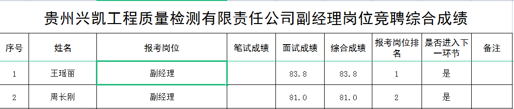 貴州興凱工程質(zhì)量檢測有限責任公司2022副經(jīng)理崗位競聘綜合成績名單公示