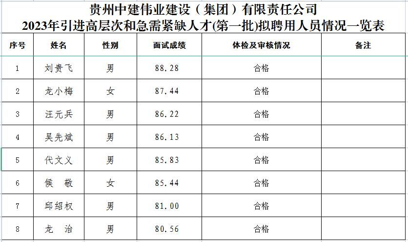 根據(jù)《貴州中建偉業(yè)建設(shè)(集團)有限責(zé)任公司高層次人才和急需緊缺人才引進工作方案》,經(jīng)報名、資格審查、面試、體檢和考察等程序,劉貴飛等八位同志列入貴州中建偉業(yè)建設(shè)(集團)有限責(zé)任公司2023年引進高層次和急需緊缺人才(第一批)擬聘用對象(詳見附件),現(xiàn)予以公示。